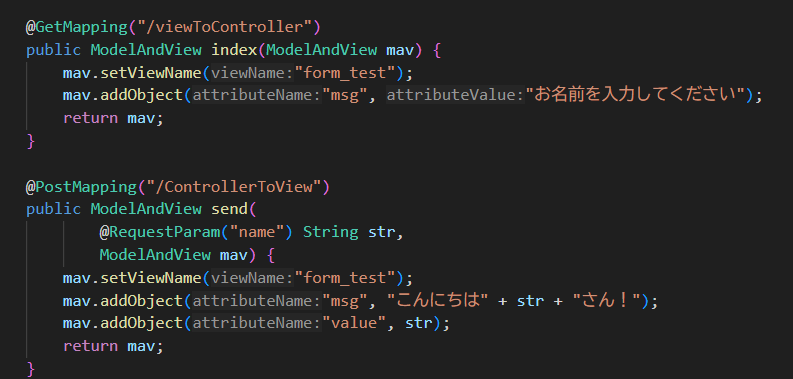 上の画像に出ていたModelAndViewですが、こちらは遷移先のviewの名前や画面に送信するパラメータの設定をまとめることができます。