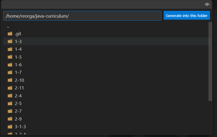 フォルダ生成の場所を聞かれるので、java-curriculum配下を指定してください
