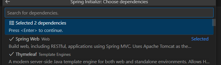 最後に、依存ライブラリが聞かれるので、Spring WebとThymeleafを選択してください。選択したらEnterを押します