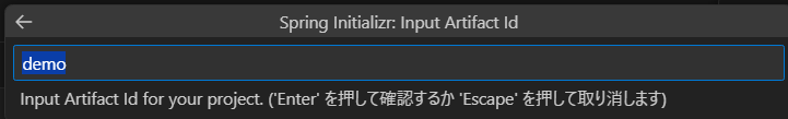 アーティファクトIDを設定します。アーティファクトとは、コードやドキュメント、ビルド済みのアプリケーションなどのことを指します。今回はでデフォルトの「Demo」で設定します